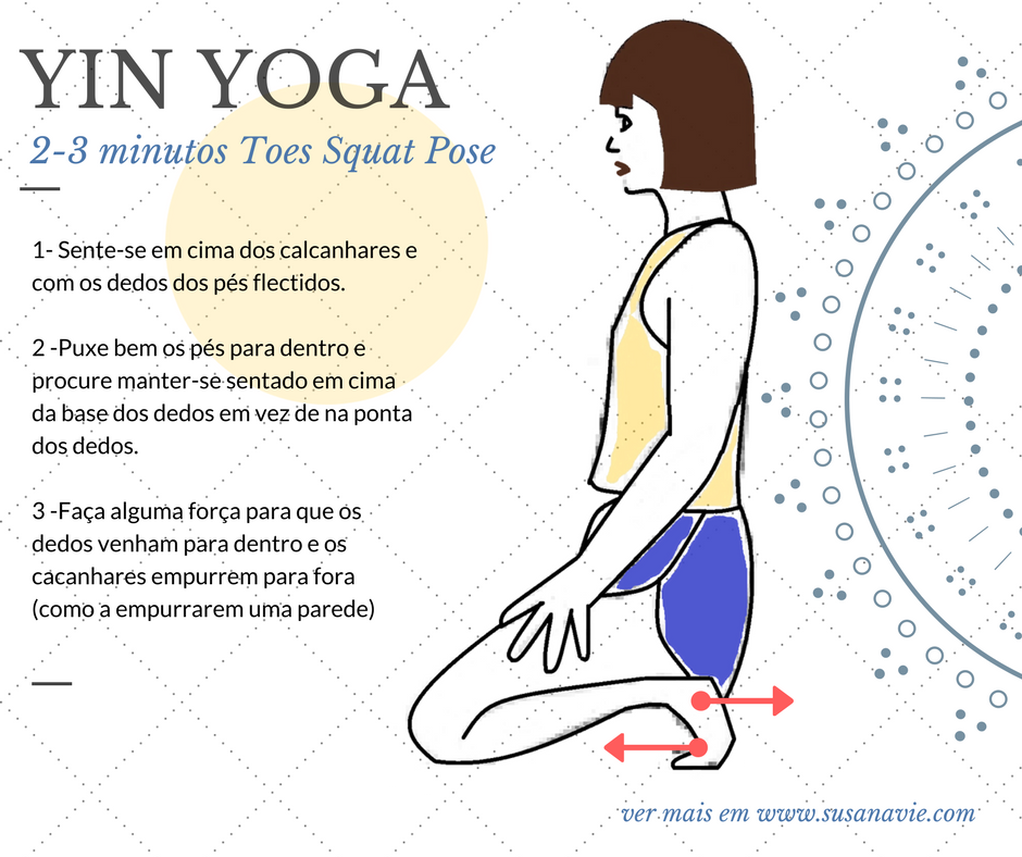 Efeito: Abre os pés e fortalece os tornozelos. Alivia a tensão dos dedos dos pés. Ideal para corredores ou para quem no dia-a-dia anda de salto alto.